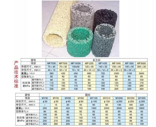 1、塑料盲沟材的组成纤维为2mm左右的丝条,相互接点熔结成型,呈立体网状体,其原理与钢结构造物的桁架原理相同。表面开孔庇为95-97%,是有孔管的5倍以上,是树脂网格管的3-4倍,表面吸水率极高。